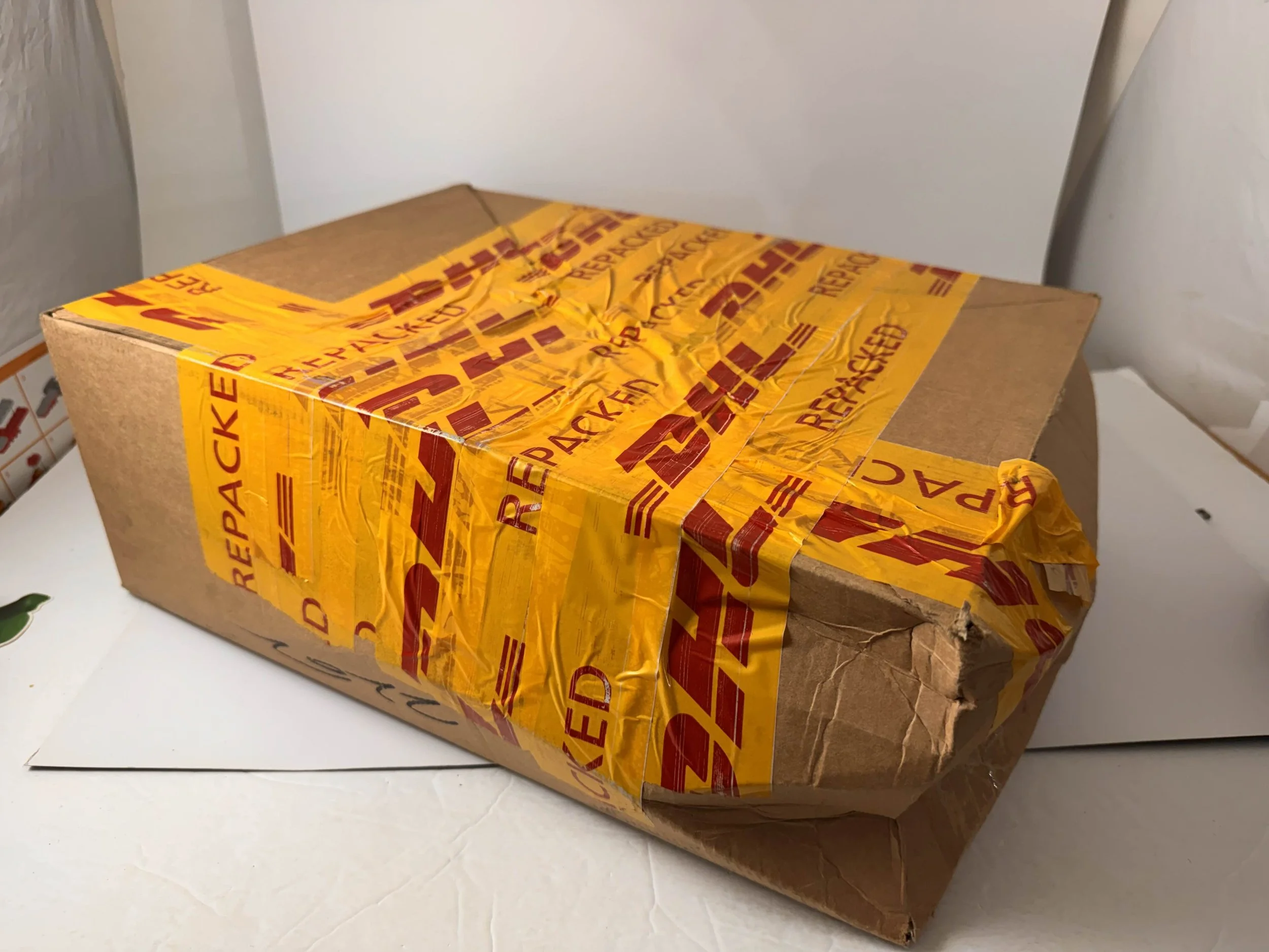 But there were some challenges ahead! The first sign of trouble was a DHL shipping delay and catastrophic box damage. This box seems to be more tape than cardboard now: