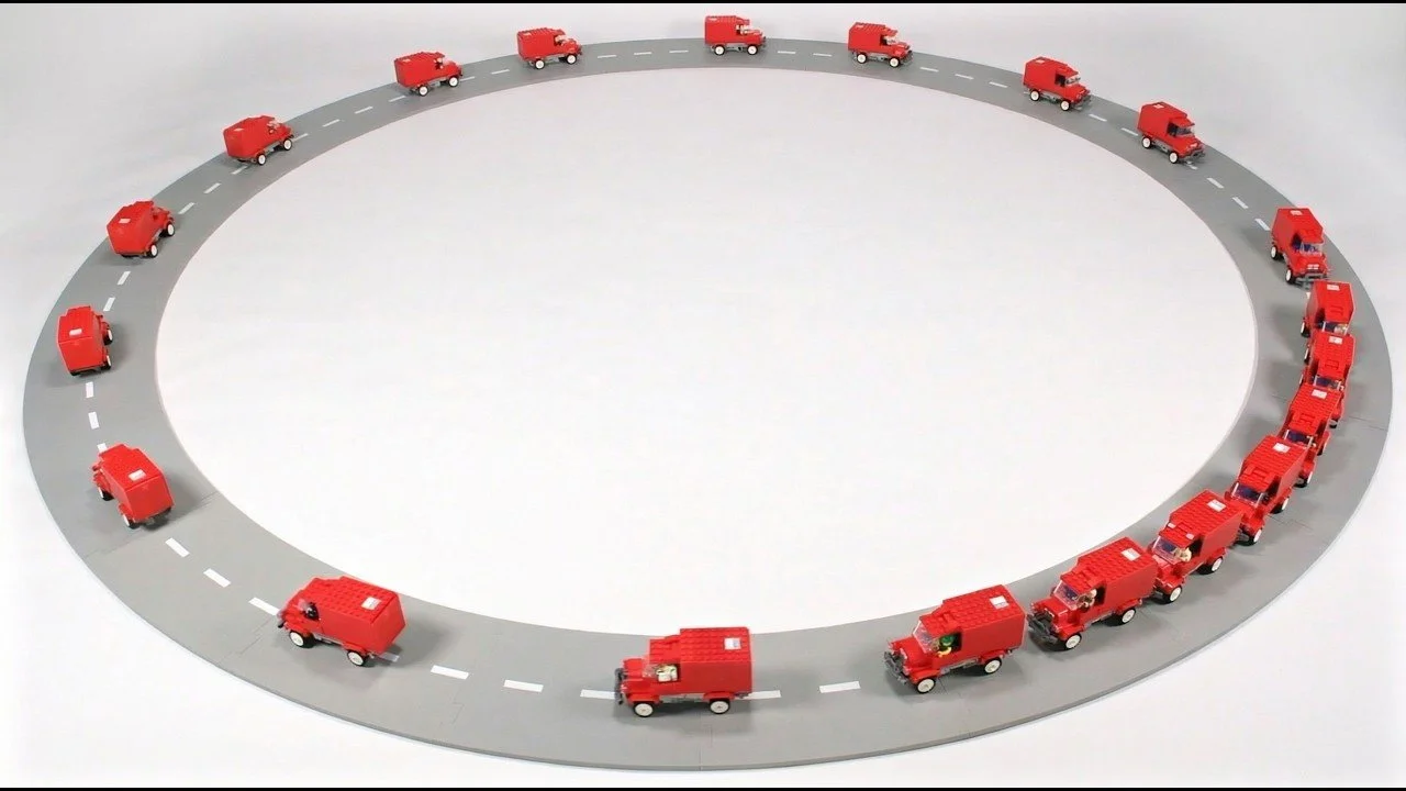 This experiment recreates real-world traffic flow using 22 LEGO cars on a circular track, combining brick-built vehicles, a magnet-guided road system, and programmed driver behavior to show how jams can form seemingly out of nowhere once density crosses a tipping point.