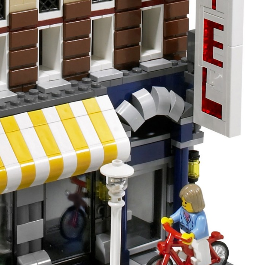 Cafe Corner, as well as countless Castle MOCs over the years, utilizes this trick. These 1 x 2 x 1 ⅓ curved slopes are attached to the underside of the 1 x 6 x 2 arch, which cannot be done with the newest version of said arch.