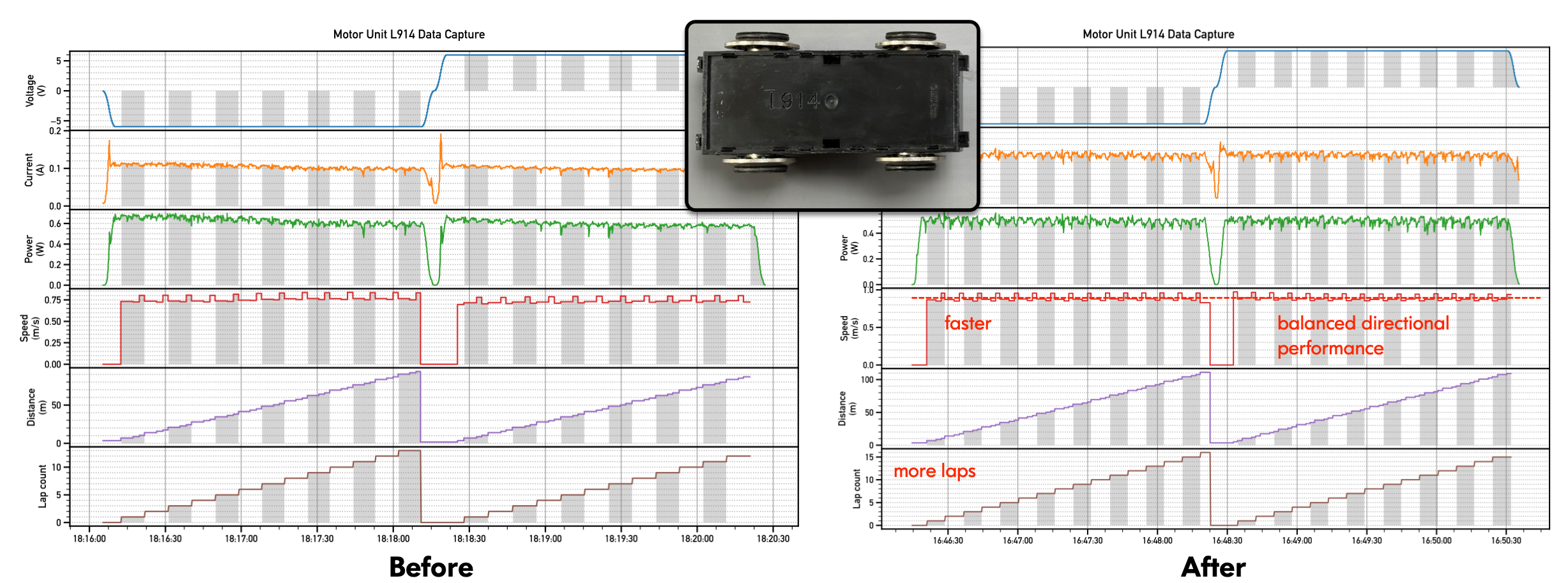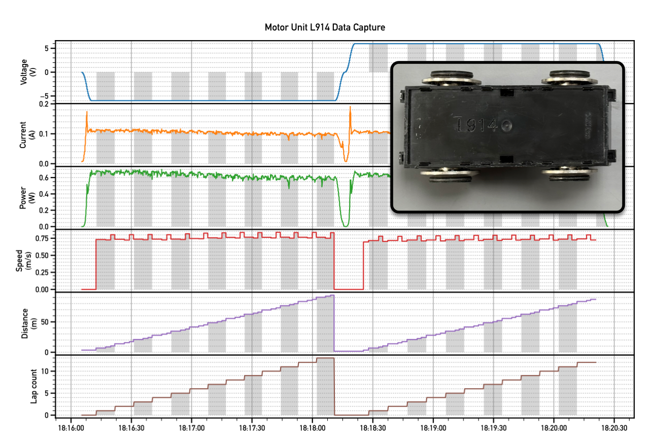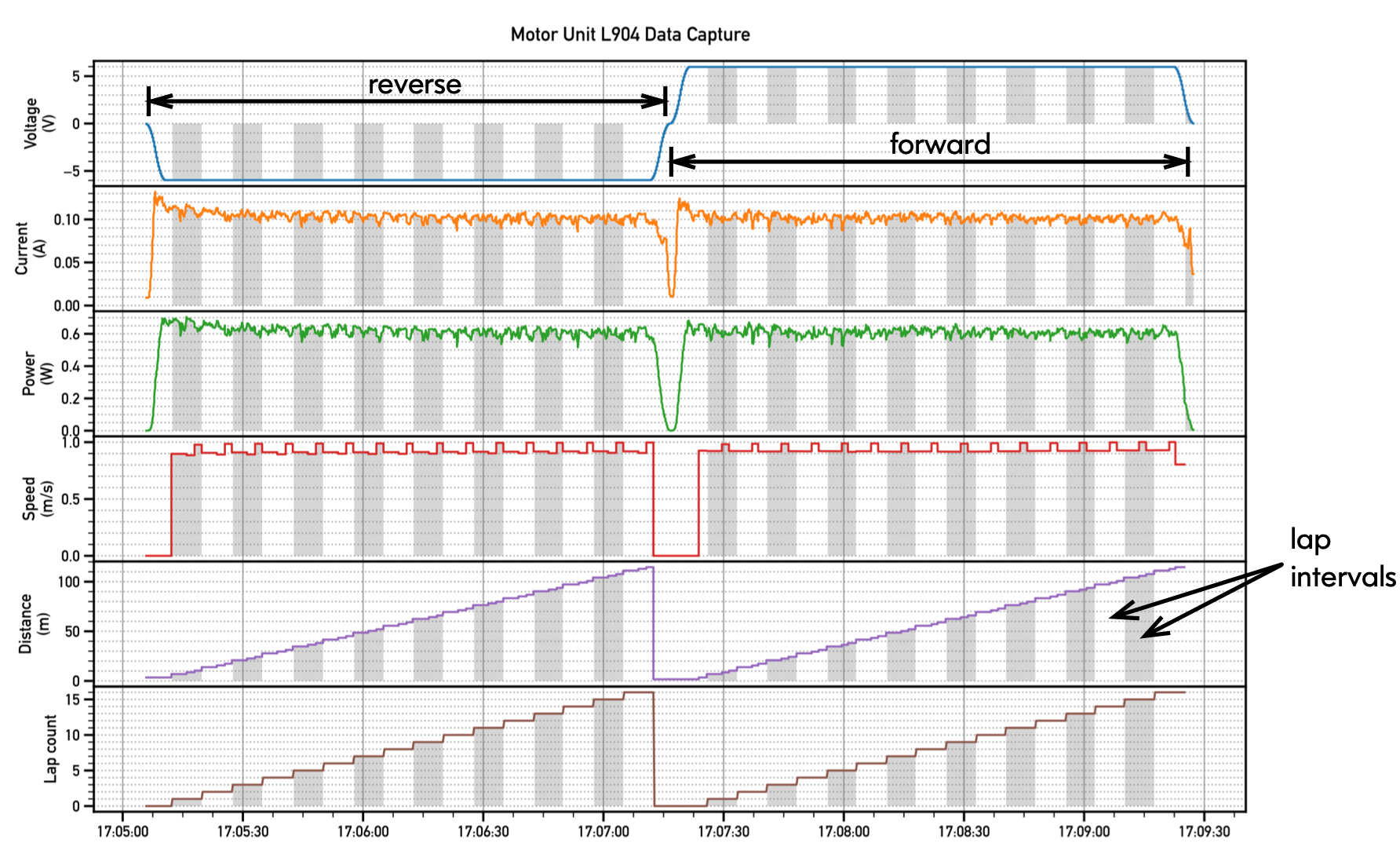 This data capture comprises thousands of time-stamped measurements from different sensors. The computer applies a pre-scripted voltage profile for operation in both directions and collects samples of current, power, speed, distance, etc. The grey/white bars overlayed in the data mark individual lap intervals. This helps us correlate data variation that is a function of loop location or geometry. Some interesting features to note from this capture: