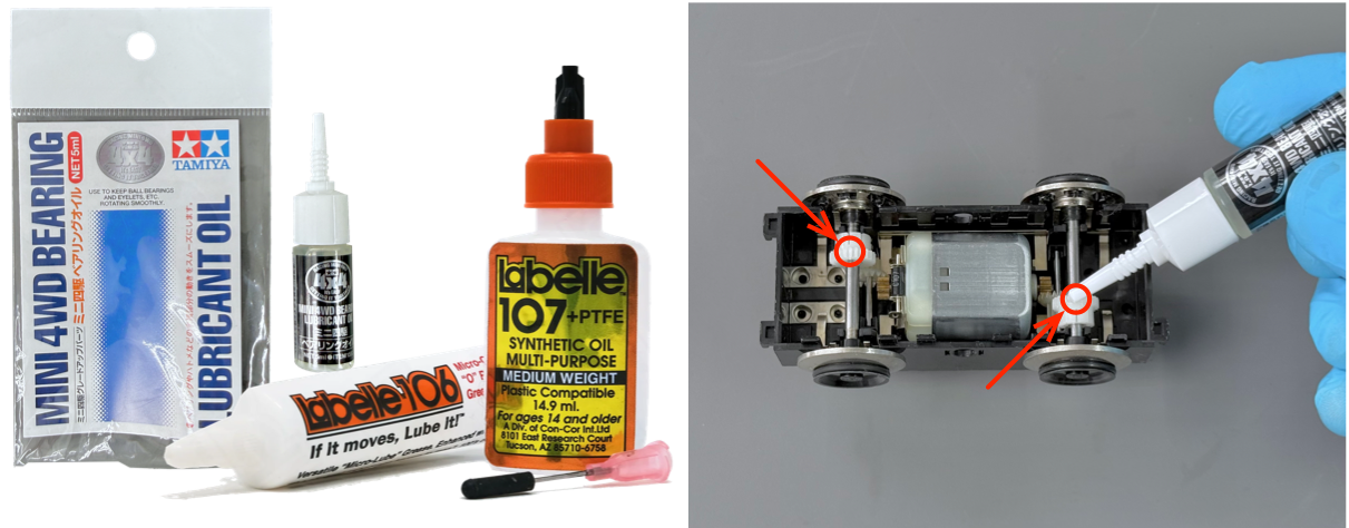 Fortunately, there are several modern synthetic plastic-safe lubricants made specifically for models/toys I can recommend. These include Labelle 102, 106, 107 and Tamiya 4WD RC lubricant oil. My preference is Labelle 102, since it is a lightweight oil packaged with a precision needle-like metal dispensing shaft. When it comes to lubrication, applying too little is better than too much—usually, a single tiny drop is required for each lubrication surface.