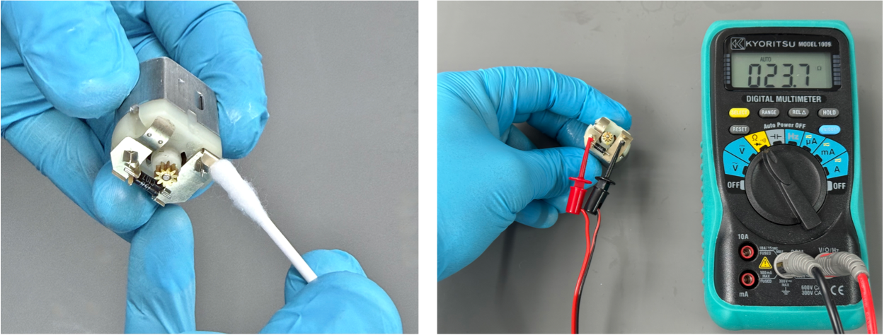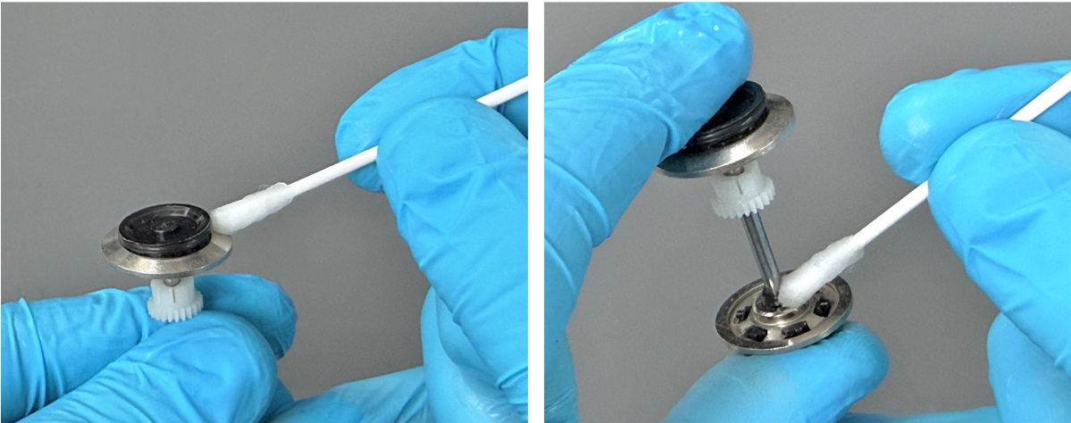 Now we can turn our attention to the motor itself. Gently clean all of the motor’s contact tab surfaces with a cotton bud soaked in IPA. Also, clean any other surfaces that have visible contamination from dirt, grease, etc.