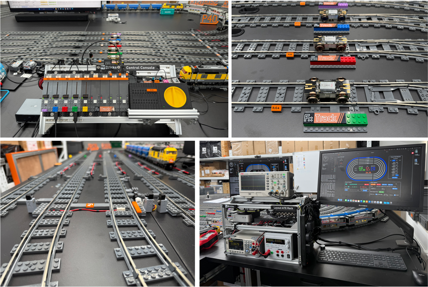 One of the key features of our development lab is a five-track test layout. This contains five nested loops of track ranging from 56 to 120 studs radius with interconnected crossovers among each loop. This allows us to operate the trains over a variety of straight, curve and switched track geometries to ensure consistent performance and watch for any problems with challenging geometry. The layout is controlled either manually from a control console or fully automated by a dedicated computer test rack.