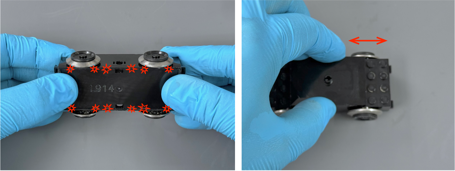 The last cleaning process is to re-clean the plastic bogie enclosure and bottom cover in warm soapy water. This will remove any residues from cleaning with IPA and remove any water-soluble dirt or staining. Pat dry with lint-free tissues and set aside to air dry thoroughly.