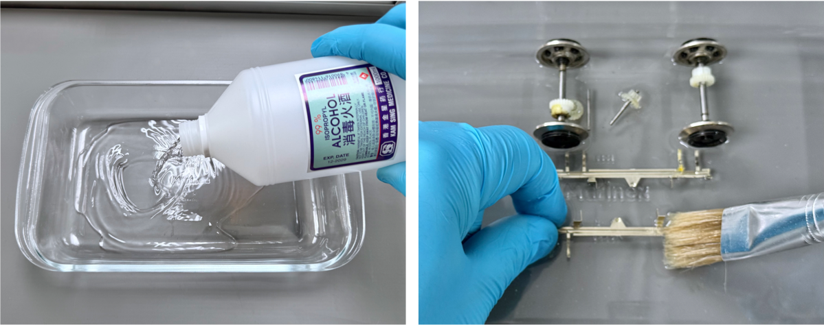 Pour a shallow quantity (approximately 5 mm deep) of IPA into a medium-sized Pyrex or glass baking dish. Place all of the bogie mechanical components (wheel/axles, crown gears/axles, pickup tab frames) into the IPA.