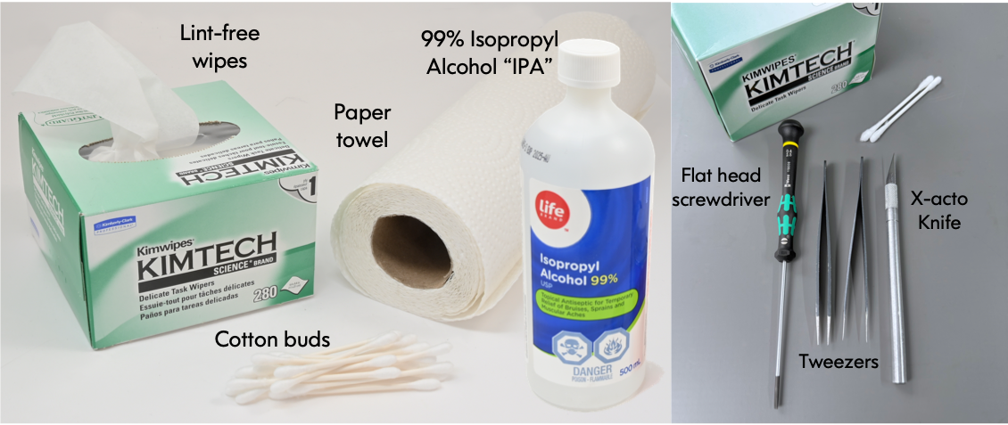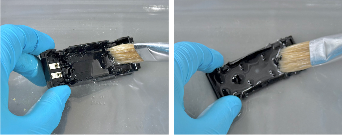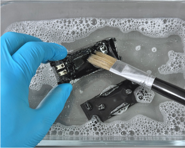 Ensure that you wear gloves while cleaning. Take each component and gently scrub with an old paintbrush soaked in IPA. Work the brush into every crease, gap, and surface of each component. Rinse the brush frequently in fresh IPA as you clean so that contaminants picked up by the brush can be released into the dish.