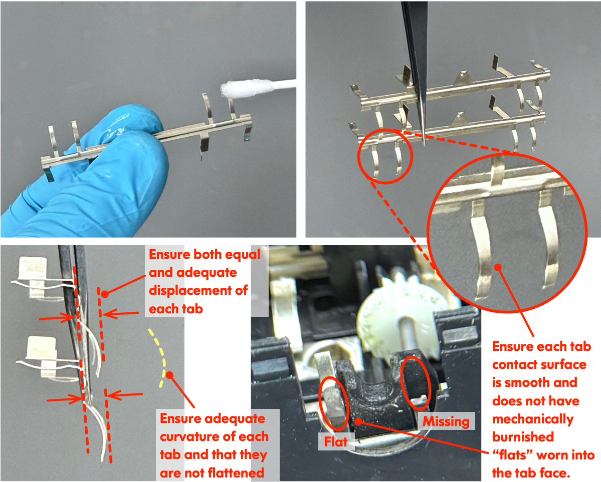 After rebuilding several motors, I noticed some of them squeaked with a high-pitched squeal. It took me a long time to discover that the curved contact tabs were vibrating like high-pitched “tuning forks”! Counterintuitively, these surfaces, despite being used for electrical contact, require lubrication to avoid squealing. As it turns out, this lubrication has no impact on the electrical performance of the pickups, and the bogies work reliably as expected.