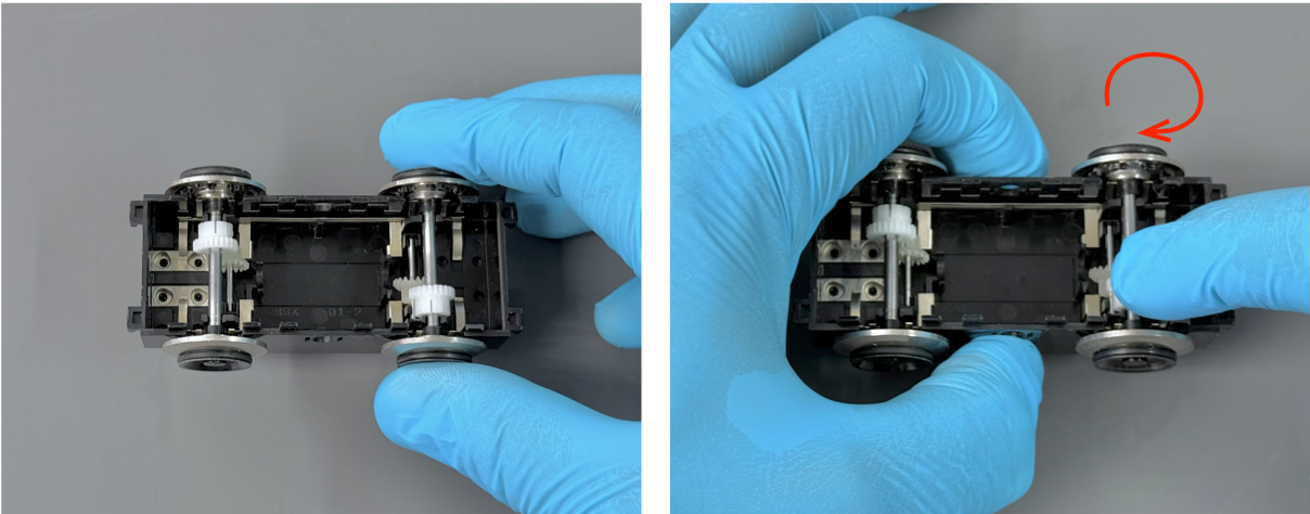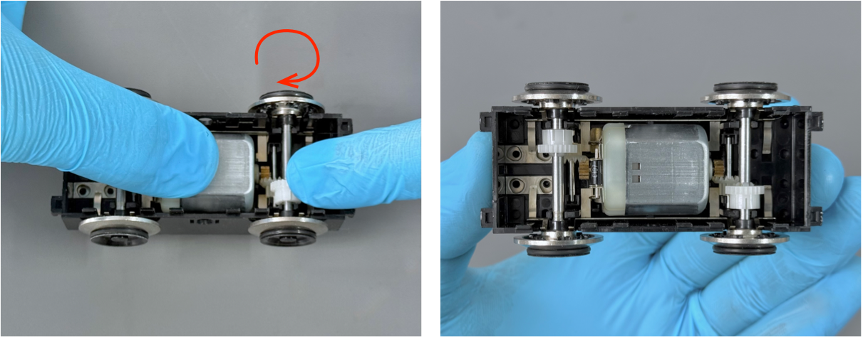 With the bottom cover securely installed, place the bogie down onto its wheels and gently move it back and forth a few times. This will help the lubricants to disperse evenly among the gears and bearing surfaces. You might notice that the movement of the bogie will become more fluid and smooth as the lubricants work their way into the components.