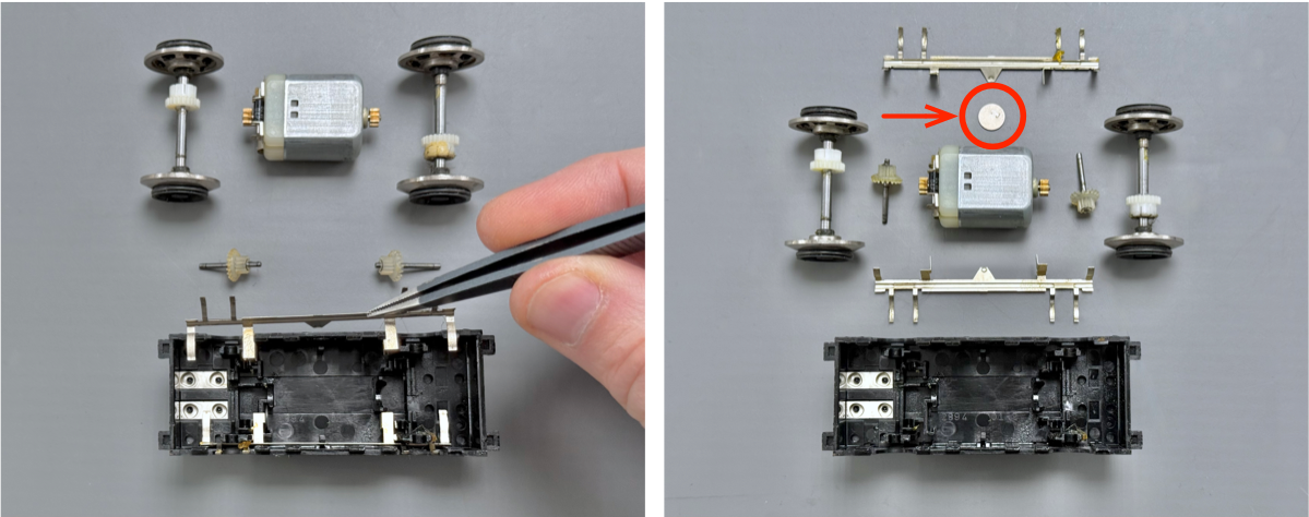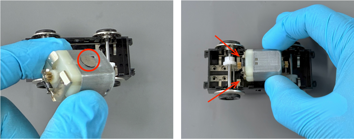 Place the small round spacer disc on the motor casing as shown. It should magnetically retain itself in position while the motor is installed into the bogie.