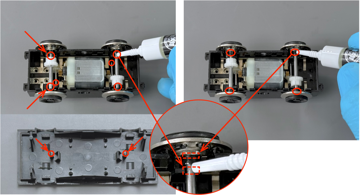 Then add one drop of lubricant to each axle bearing, including the two small bearing posts on the bottom cover.