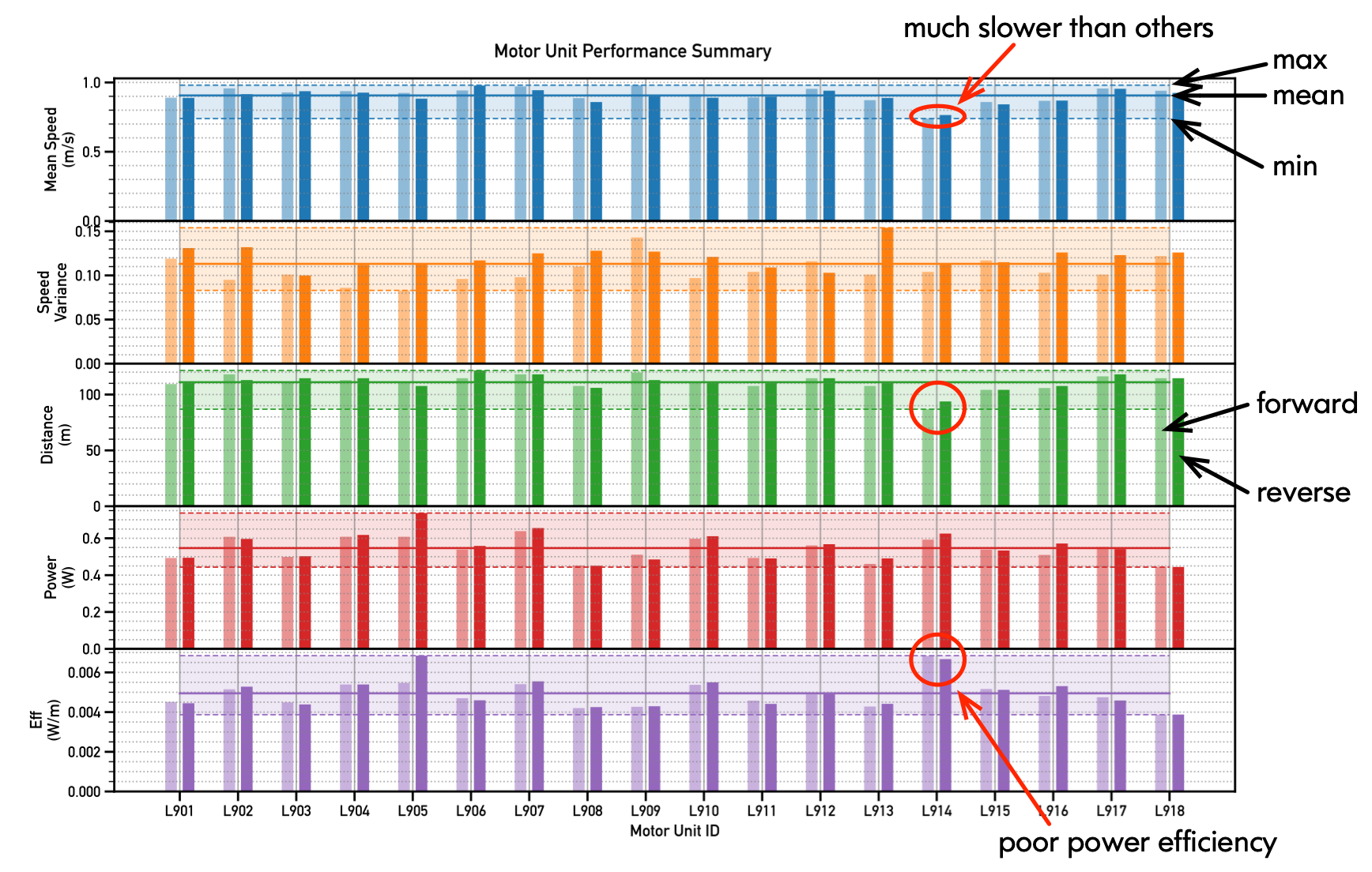 Performance data for all 18x 9V motor bogies was collected and analyzed so that the performance of each unit could be compared. The chart below shows comparisons of each motor’s speed, distance traveled, and average power consumption in both directions. Ideally, we would expect every motor to travel the same distance for a given fixed time interval in both directions. However, we can see some units performed much worse than the average of its peers; for example, unit L914 was much slower.