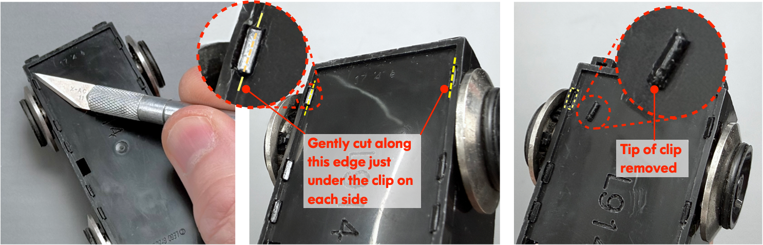 Instead, resort to a method that I found works well and minimizes damage to the bogie: Using a sharp hobby knife, gently slice away the tips of the first pair of clips which secure the bottom cover. To minimize the possibility of injury and damage to the bogie, use many gentle controlled cuts rather than a forceful cut to remove the clip tops. After a few passes with the knife, the tip should separate.
