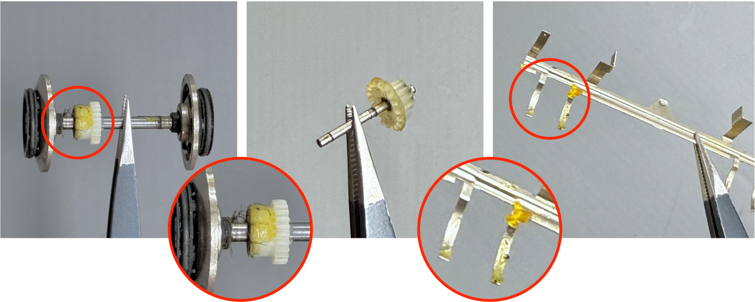Using tweezers, lift out the crown gear axles. Be careful during removal, since the crown gears are not secured to the axles and easily slip off.