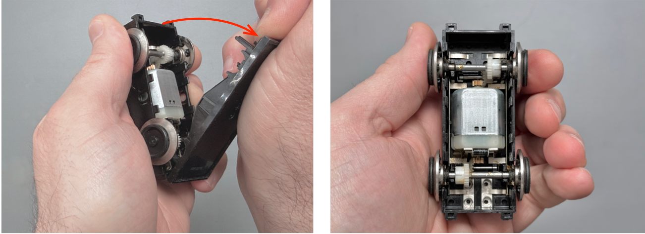 With our freshly lubricated motor bogie, we can snap the bottom cover back on. Hold the motor bogie upside down and carefully align all of the clips. Press together firmly and evenly, ensuring each clip engages and that the bottom cover is mounted with no gaps in the seam between them.