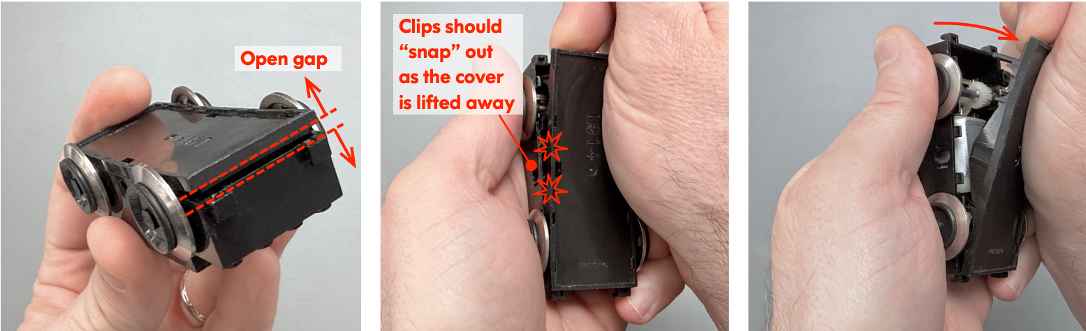Hold the motor bogie upside down securely with one hand and use your other hand to progressively pry open the case. You may have to wiggle and pull strongly (but carefully) to release each successive pair of clips along the entire length of the bogie. Work slowly and methodically, and be ready to restrain your hand when each set of clips suddenly releases with a “snap”.