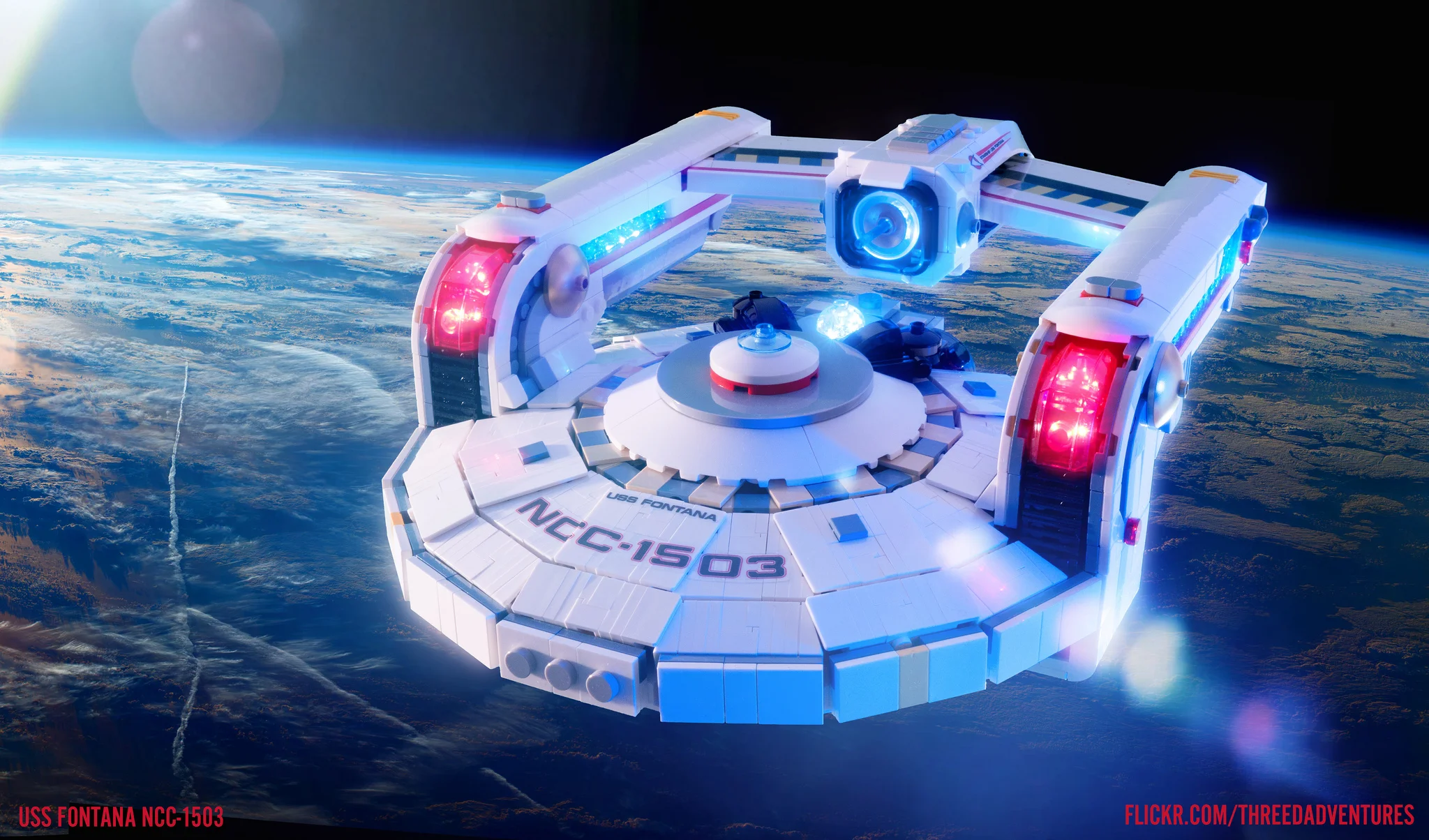 /Builder Ben Smith is back with another stellar Starfleet build. Welcome aboard NCC 1503, The USS Fontana. Seeing this ship, especially these well crafted composite shots of it, immediately puts me in a Star Trek mood. I can hear the music, sound effects. I can see the motion in my imagination, they’re right out of a movie, and I want to be in a darkened theater right now watching it.